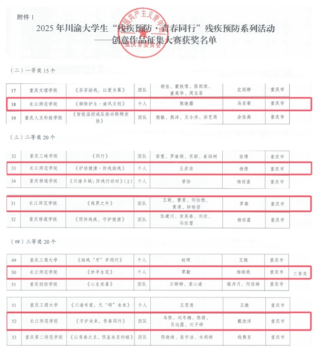 9月11日,由共青团重庆市委员会、重庆市教育委员会、重庆市卫生健康委员会、重庆市残疾人联合会联合共青团四川省委员会等共同主办的川渝大学生“残疾预防·青春同行”残疾预防创意作品征集大赛获奖名单公示。其中,一件作品荣获一等奖,两件作品荣获二等奖,两件作品荣获三等奖。