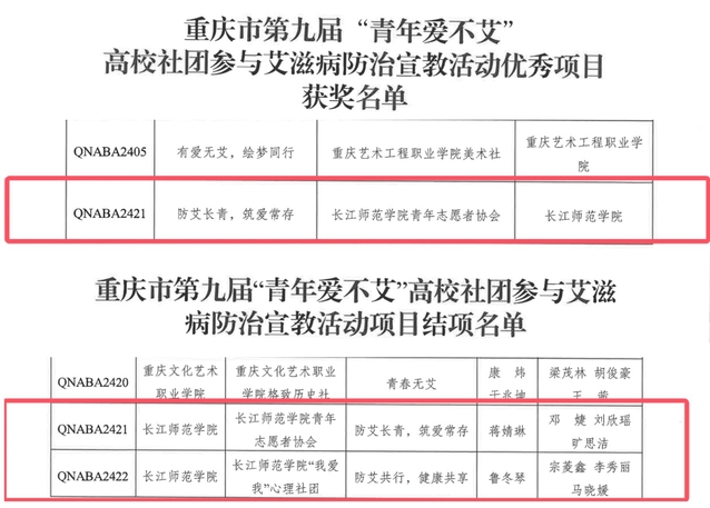 9月8日,由重庆市教育委员会、重庆市疾病预防控制局联合主办的第九届“青年爱不艾”高校社团参与艾滋病防治宣教活动获奖名单和结项名单公布,我校青年志愿者协会《防艾长青,筑爱常存》获评优秀奖,“我爱我”心理社团《防艾共行,健康共享》成功结项。
