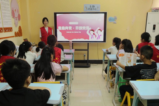 “回望1949年10月1日,五星红旗第一次在天安门广场冉冉升起,站起来了的中国人民在神州大地开启了一个新的纪元......”志愿者们通过图片展示、视频展播等形式,带领小朋友们直观感受党和国家事业取得历史性成就、发生历史性变革,引导孩子们大力传承红色基因、传承中华文脉、传承奋斗精神,为强国建设、民族复兴伟业时刻准备着,努力成长为德智体美劳全面发展的社会主义建设者和接班人。
