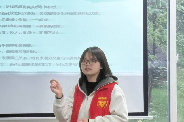 创意绘画课上,志愿者从点、线、面切入课程,引导孩子们用画笔自由描绘心中最喜爱的水果,并鼓励他们积极分享展示。这一举动既调动孩子们的课堂参与度,又激发他们的艺术潜能。接着,志愿者结合时节,围绕中国传统节气“霜降”进行生动讲解,采用图片展示与生活常识相结合的方式,为孩子们介绍霜降的物候特点、民间习俗和日期,让他们在趣味学习中了解传统文化,感受季节变化的魅力。