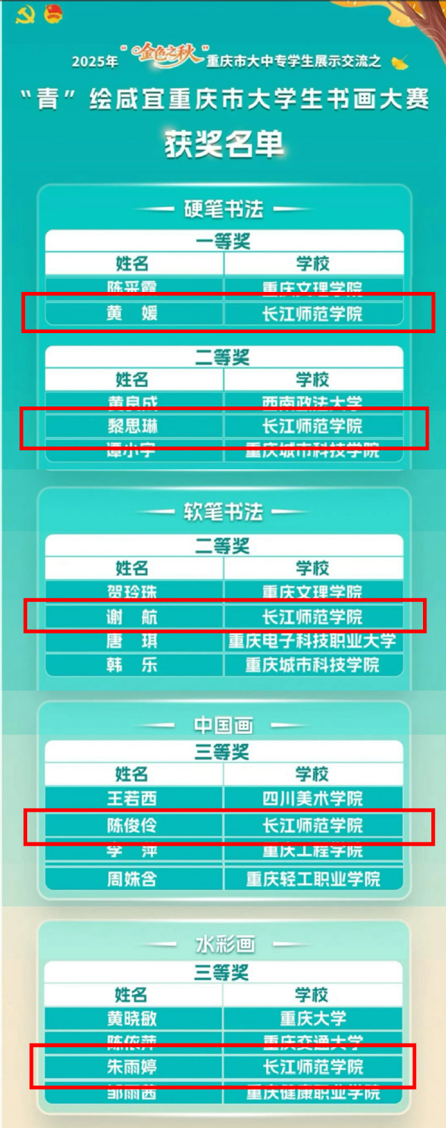 近日,在2025年“金色之秋”重庆市大中专学生展示交流活动之“青”绘咸宜重庆市大学生书画大赛决赛中,我校学子表现优异,斩获一等奖1项、二等奖2项、三等奖2项。获奖作品分别来自人文学院、数学与统计学院、化学化工学院和教师教育学院。