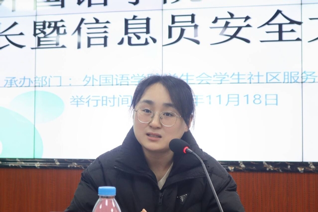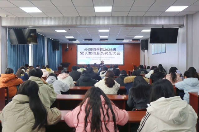 为进一步规范寝室管理,保障学生的在校安全与身心健康,11月18日,外国语学院于钩深楼501全境实训室召开2025级室长暨信息员安全大会,2025级辅导员陶歆妍担任主讲人,2025级全体寝室长积极参与。