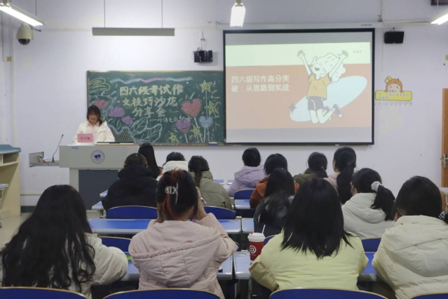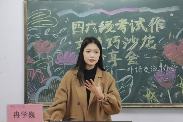 为助力学生备战英语四六级考试,提升写作水平与应试能力,11月26日,外语交流协会于诚意楼501举办四六级考试作文技巧沙龙分享会。2023级英语师范3班冉学巍担任主讲人,全校学生积极参与。