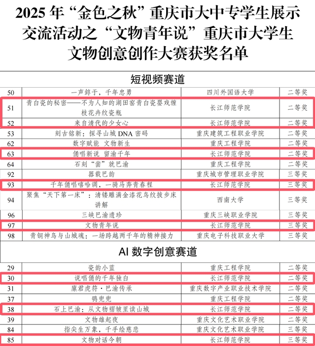11月28日,由市教委、团市委等联合举办的2025年金色之秋“文物青年说”重庆市大学生文物创意创作大赛公布获奖名单,我校传媒学院四部作品荣获短视频赛道二等奖三项、三等奖一项;化学化工学院四部作品获AI数字创意赛道二等奖两项、三等奖一项,以及短视频赛道三等奖一项。