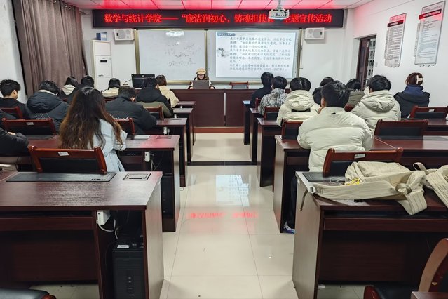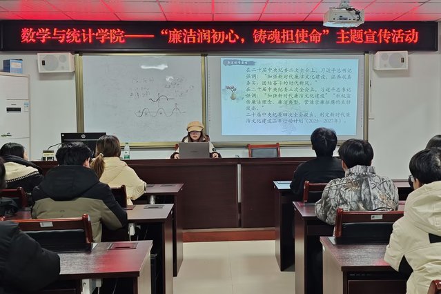 12月4日,数学与统计学院在钩深楼附楼206开展“廉洁闰初心,铸魂担使命”主题宣传活动。廉洁文化宣讲成员傅钰淇担任主讲人,学院学生代表参加。