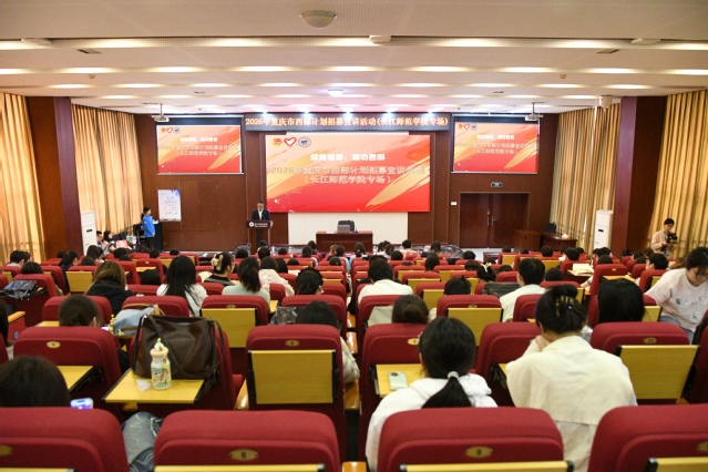 为进一步宣传普及大学生志愿服务西部计划政策,引导青年学子投身基层、服务国家发展,4月24日,2026年重庆市西部计划招募宣讲专场活动于我校摇光学术报告厅顺利开展。市项目办、涪陵区、武隆区、垫江县、石柱县西部计划项目办有关负责同志,优秀西部计划志愿者及2022级应届毕业生代表参加此次活动。